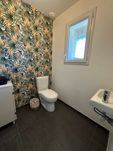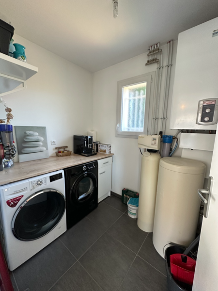 REZ-DE-JARDIN : ENTREE avec rangement, CUISINE US équipée, SEJOUR-SALON lumineux, 1 SUITE PARENTALE (14 m² : avec salle d'eau), 1 W.C séparé, 1 placard sous escalier, 1 BUANDERIE.