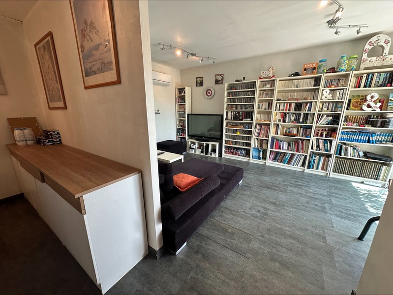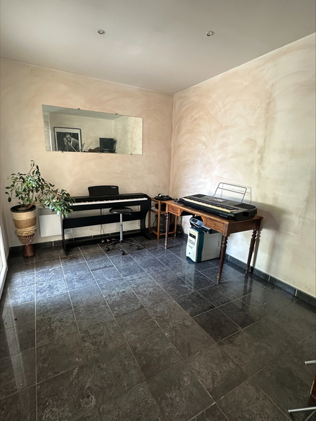 REZ-DE-JARDIN : ENTREE avec placard mural, CUISINE US équipée + SEJOUR (55 m²), 1 PIECE (26 m² dont une BUANDERIE), 1 CHAMBRE (9.79 m² avec porte fenêtre), 1 W.C. séparé.