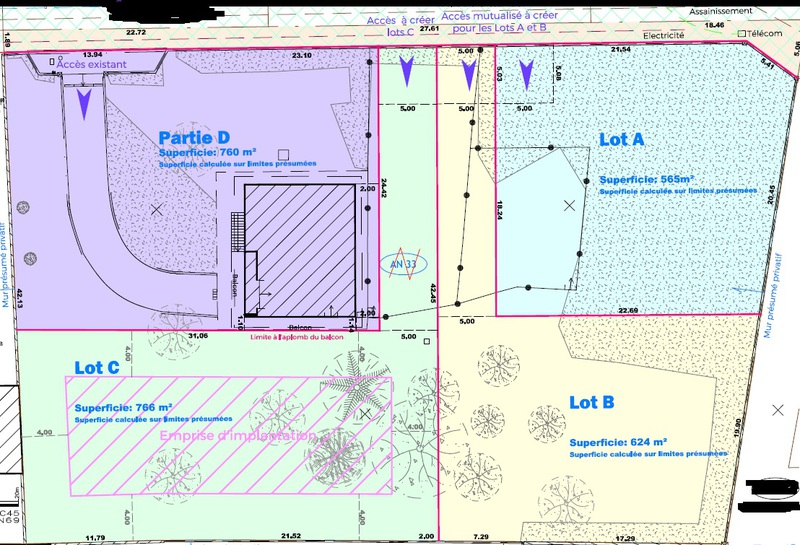 565 m² (bornage 2025) - CES (Coefficient d'Emprise au Sol) de 0.25 soit 141 m² avec 2 possibilités :